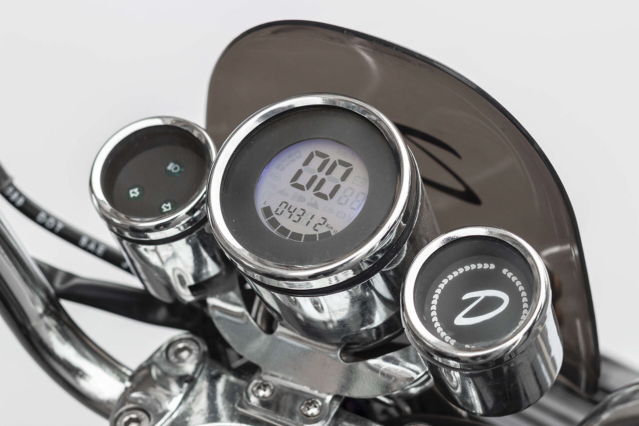 El scooter cuenta con una batería de litio de 20 Ah para un alcance de 60 km. La batería se puede cargar en 20 minutos.