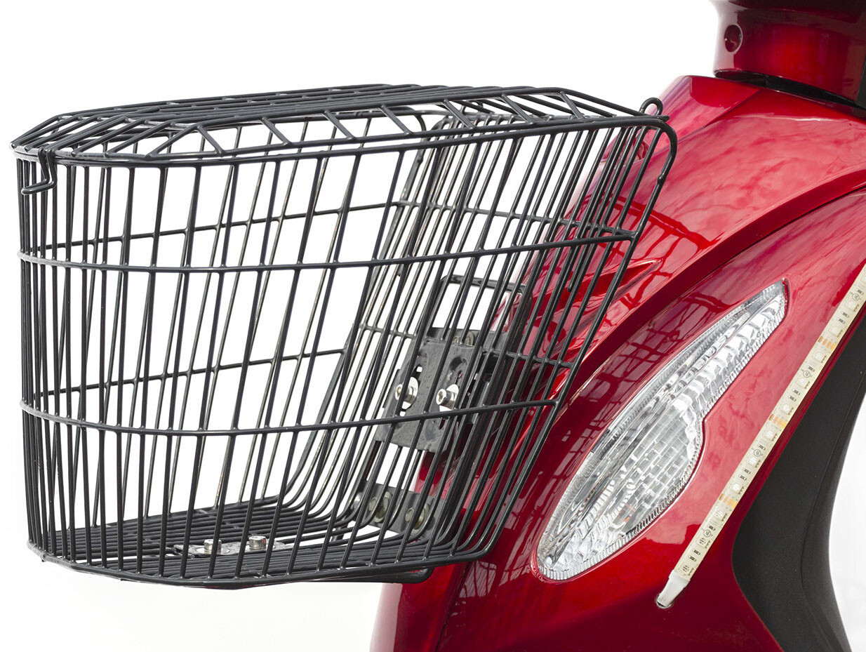 El scooter viene equipado de serie con una gran caja de carga trasera y una canasta de carga delantera.